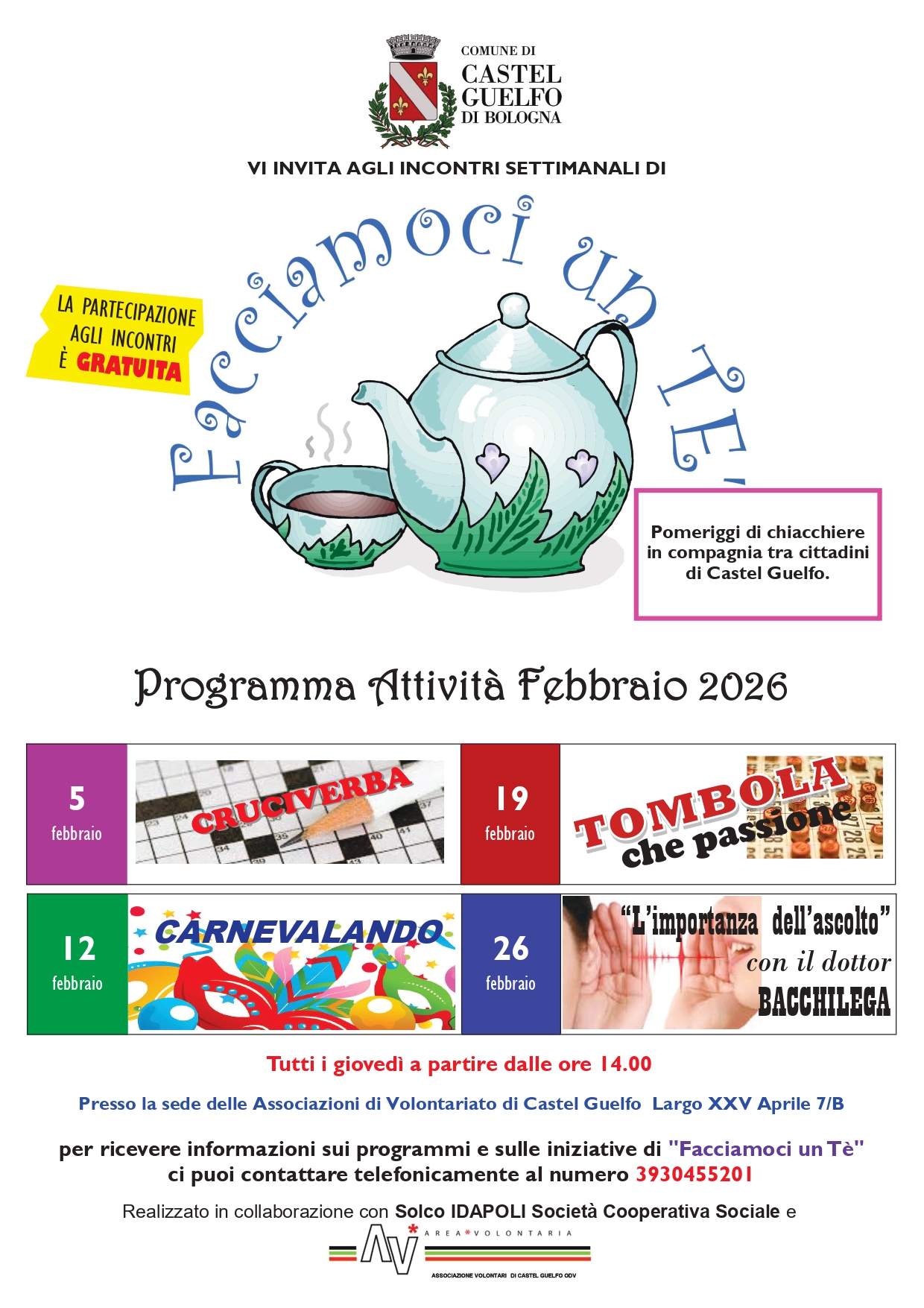 Presso la sede dell’Associazione Volontari di Castel Guelfo di via Largo XXV Aprile 7/B, si svolgono i pomeriggi di chiacchiere in compagnia tra cittadini di Castel Guelfo.