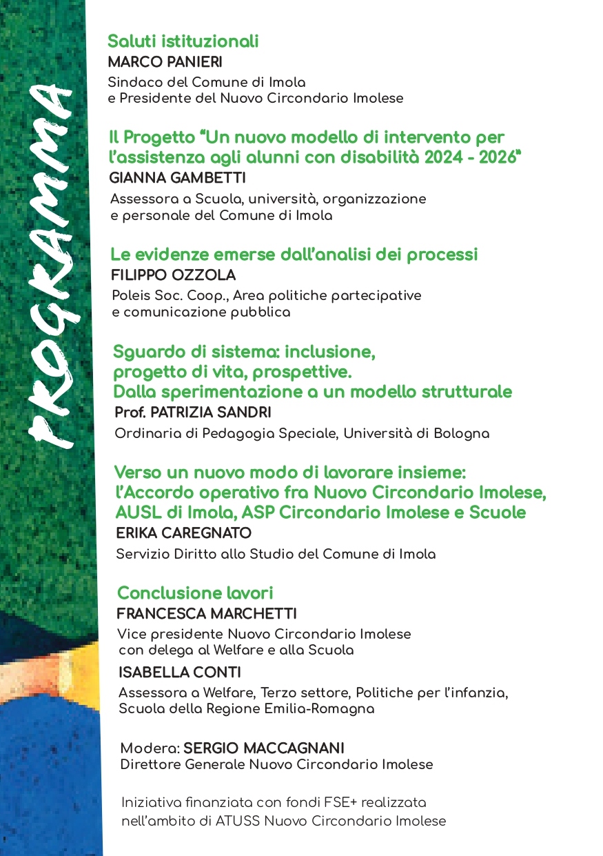 Il Nuovo Circondario Imolese invita cittadini, operatori, famiglie e tutti i soggetti interessati a partecipare a questo momento di approfondimento e costruzione condivisa, che segna un passaggio fondamentale verso un sistema educativo sempre più inclusivo, equo e orientato al futuro.