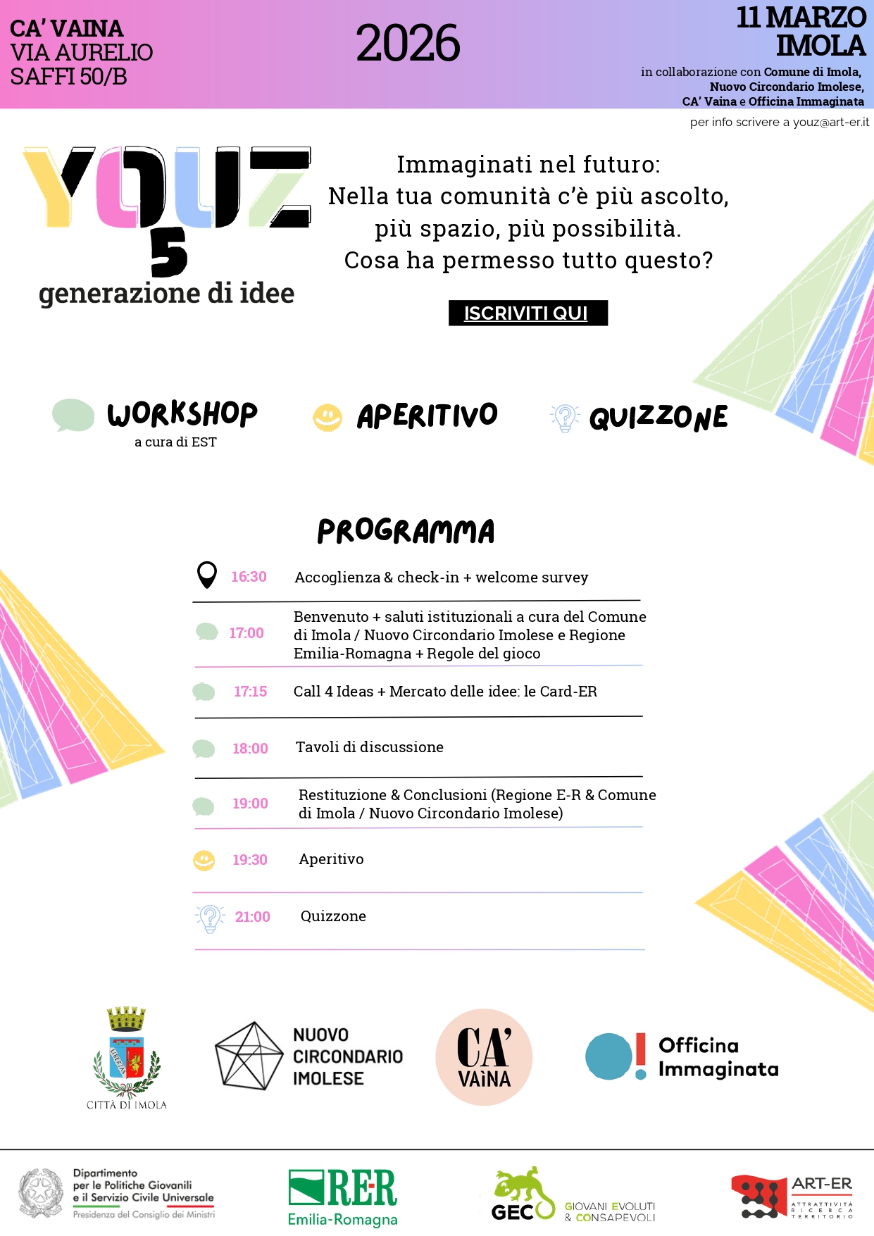 L’incontro, realizzato in collaborazione con il Comune di Imola, il Nuovo Circondario Imolese, Ca’ Vaina e Officina Immaginata, si articolerà in attività laboratoriali e momenti di restituzione collettiva, all’interno di un contesto informale ma ben strutturato.